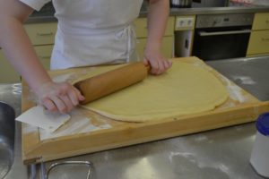 Anschließend wird der Teig rechteckig ausgerollt (ca. 5 mm dick), mit flüssiger Butter bestrichen und mit Zimt, Zucker und Rosinen bestreut. Der belegte Teig wird eingerollt und in eine mit Butter ausgestrichene Form geben. Wird die Form zusätzlich mit Zucker bestreut, entsteht eine herrlich karamellisierte Kruste.